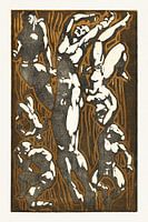 Verschillende lichamen van mannen staan afgebeeld op dit portret. Alle heren staan bloot, dus als naaktmodel op dit kunstwerk in bruin.