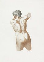 Tekening van een naakt lichaam van een kerel op de rug gezien. De romp van de vent laten de billen, heup en spieren op de rug en schouders bloot zien.