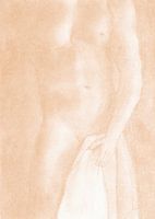 Naakte mooie gespierde man welke net zijn geslachtsdeel bedekt met een handdoekje door zijn hand halverwege zijn lichaam voor zich te houden. We zien zijn romp, borstkas, buik hand arm en een gedeelte van zijn bovenbenen . De schaduw en het licht spelen een prachtig spel van licht en donker waarbij zijn natuurlijke rondingen en spieren…