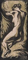 Tekening van een model welke naakt poseert op dit naaktportret. De meid op de illustratie is op de rug op het portret gezet, een naaktportret. Van het naaktmodel zijn daarom de benen, billen, een heup, rug, schouders en een tiet bloot op het kunstwerk gezet.