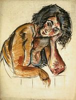 De meid is naakt en leunt ergens op terwijl ze haar hoofd ondersteunt. Doordat het naaktmodel bloot is en haar torso zichtbaar lijkt ze topless waardoor haar borsten zichtbaar zijn.