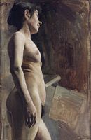 Het slanke model staat volledig ontbloot op dit naaktportret van de Finse schilder. De jonge vrouw kijkt de andere kant op. De meid staat bloot op het portret en dus zijn heup, billen, schaamhaar, buik, torso en borsten samen met bovenbenen en armen op het kunstwerk.