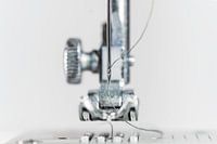 Naald en naaivoet van een naaimachine als extreme macrofoto, technische uitvinding voor de kledingindustrie, heldere achtergrond met kopieerruimte, geselecteerde focus, zeer smalle scherptediepte