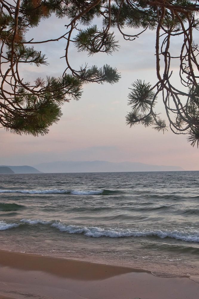 Naaldbomen en vissersboten aan de verlaten oever van het Baikalmeer in Siberië