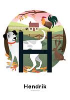 Alles met de H. Zoek zoveel mogelijk woorden met deH. Een hond en een haan. Het is herfst. Naast het huis op de heuvel staat een hondenhok en een hek van hout. Er zijn ook een hommel en een haas. En zie je de helikopter en het holletje in de boom?
