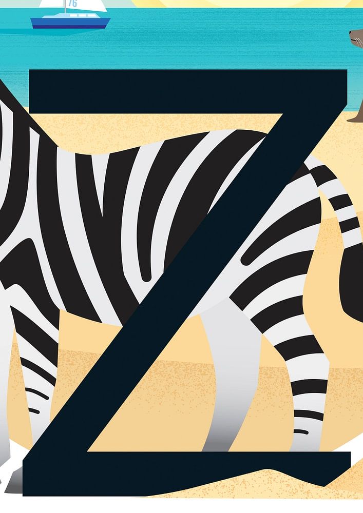 Alles met de Z. Zoek zoveel mogelijk woorden met de Z. Zie je de zebra met zwarte strepen op zijn zij? Op het zand ligt een zeester die zwaait. Een zorgeloze zeeleeuw geniet van de zon. En op zee zeilt een zeilboot met een zes en een zeven op het zeil. Wat een zalige zomer!