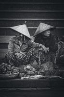Een leuk beeld van twee typische Vietnamese vrouwen op een lokale markt in Hoi An in Centraal-Vietnam.