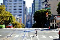Oversteken tijdens een ritje met de kabelbaan in de stad San Francisco, Californië, VS. Toen we dit kruispunt naderden, moest ik denken aan het beroemde Abbey Road-album van de Beatles dat werd veroorzaakt door de persoon die de weg overstak. De diepte waarin we'naar beneden moesten plus het uitzicht op de Bay Bridge in de verte…