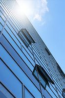 Omhoog kijkend naar de glazen gevel van een modern kantoorgebouw met enkele ramen open vanwege de hitte in Berlijn
