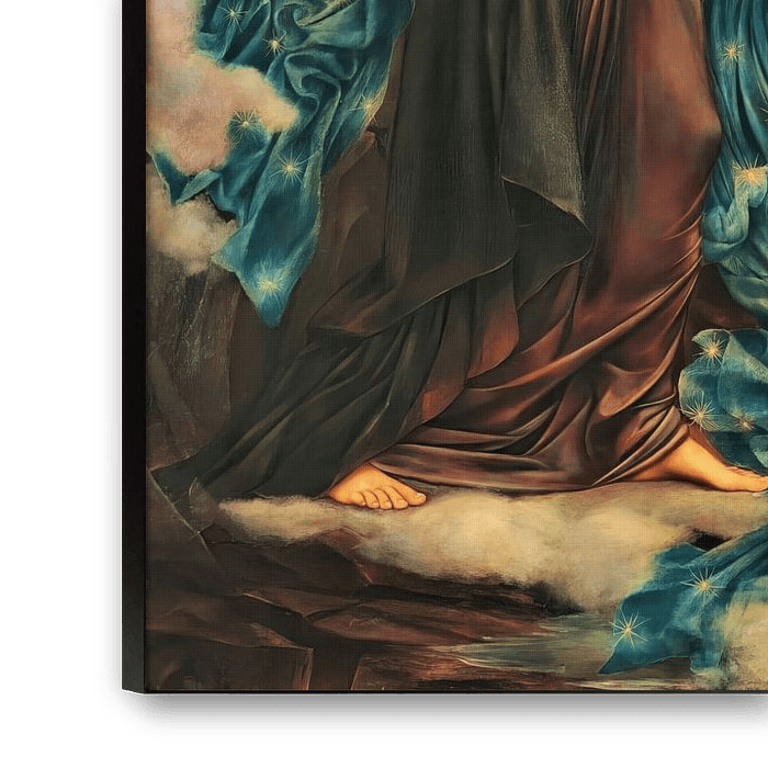Het fascinerende meesterwerk Earthbound van Evelyn De Morgan neemt ons mee naar een donkere en dorre plek waar een oude vorst nadenkt over zijn enorme stapel goud. De Engel des Doods arriveert voorzichtig en voegt iets toe aan de sombere sfeer met haar etherische aanwezigheid gehuld in een wolkachtig gewaad versierd met sterren, die de elementen oproepen waarin de goederen van de vrek spoedig zullen oplossen. De rokerige vleugel van de engel wordt verlicht door een zachte maan, wat de setting een mysterieuze sfeer geeft.