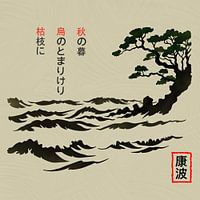 In dit werk zien we een minimalistisch, Japans geïnspireerd tafereel. Een oude boom leunt zachtjes over een kalme watermassa waar zachte rimpelingen doorheen lopen. De lijnen zijn in klassieke Japanse inkt geschilderd, wat de afbeelding…