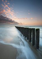 Zonsondergang op het strand van Dishoek in Zeeland. Een typisch Zeeuwse palenrij als golfbreker, kenmerkend voor vele Zeeuwse stranden, en een lucht die na een regenachtige dag open breekt. Dat in combinatie met de beweging van het terugtrekkende water levert een heerlijk lijnenspel op waar ik uren van kan genieten.