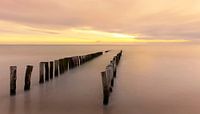 Een winter middag aan de Zeeuwse kust nabij Zoutelande. Het is hoog water en de golfbrekers wijzen naar de ondergaande zon.