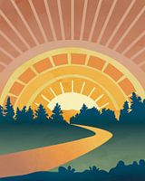Retro style abstract landschap met een pad in een wei die naar bomen en de ondergaande zon leidt.