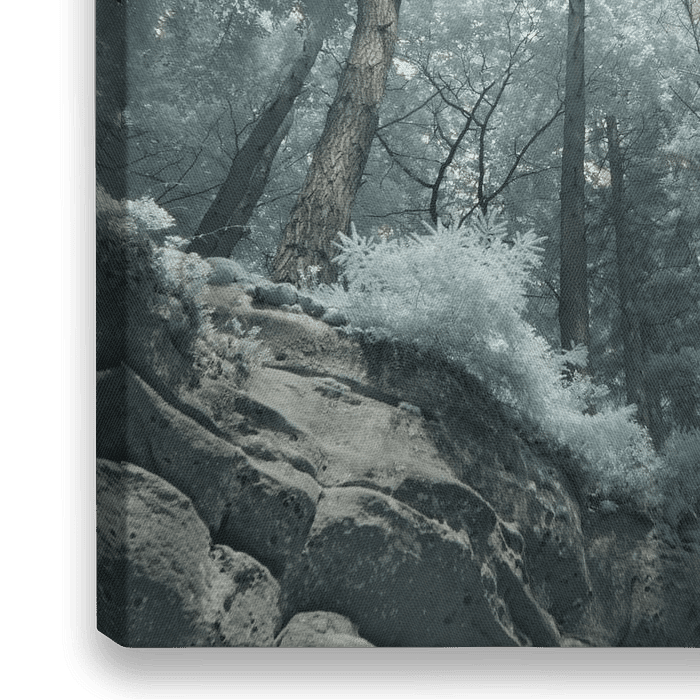 Een infraroodopname van een boslandschap, gezien vanaf de voet van de rotsen omhoog richting de boomkruinen. Door het gebruik van infraroodlicht reflecteert het bladerdek het aanwezige licht en ontstaat een zachte, verstilde sfeer waarin contrast en structuur subtiel samenkomen.