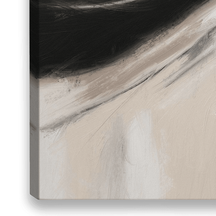 Een modern abstract werk met krachtige zwarte en witte streken die contrasteren met zachtere beige en crèmekleurige tinten, met een ronde vorm die een maan of zon zou kunnen voorstellen. Dynamische lijnen en contrasterende vormen creëren beweging en diepte in de compositie.