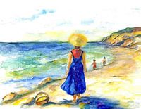 De kinderen spelen in het water en hun moeder met haar blauwe jurk en gele zonnehoed , houdt ze in de gaten. Het is een zomers plaatje en is hier vast gelegd met een aquarel schilderij.