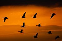 Het is herfst. De ganzen maken zich klaar om te vertrekken naar het zuiden in het Nationaal park Lauwersmeer. Een groep ganzen vliegt voorbij tegen een mooie rood gekleurde lucht terwijl donkere wolken een herfststorm aankondigen.