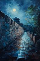 Een stil pad baant zich een weg onder het mystieke licht van de maan, dat de oude stenen van de muur laat gloeien. Een nauwelijks zichtbare pagode troont op de achtergrond als bewaker van de tijd, omringd door schaduwrijke bomen die bijdragen aan de mysterieuze sfeer. De nacht ademt verhalen van vervlogen tijden en stil afscheid.