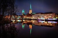 Uitzicht over de rivier de Trave naar de oude stad Lübeck