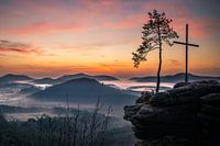 Landschap in de Pfalz Duitsland, ochtend zonsopgang, mist, heuvels en kruis