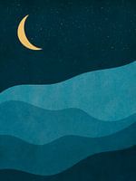 Nacht in de Bergen is een abstracte print van een berglandschap bij nacht. De illustratie is opgebouwd uit diverse tinten blauw met natuurlijk de gele maan en sterren. Tenslotte is er een waterverf effect toegevoegd voor een bijzondere watercolor look.