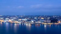 De historische schepen worden weerspiegeld in het donkere water in de zachte gloed van de havenlichten. Door de kalme avondstemming komen de contouren van de schepen duidelijk naar voren, terwijl de achtergrond wegzinkt in diepblauw. Het warme licht benadrukt de details van de scheepswanden, masten en opbouw en verleent het motief een stille waardigheid.