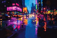 In de schemering ontwaakt de stad voor een kleurrijk spektakel: neonlichten reflecteren levendig op de gladde straat terwijl taxi's voorbij suizen. De koele nachtlucht draagt het zachte gezoem van het stadsleven, terwijl een vleugje magie de vochtige lucht doordringt. Hier pulseren kleuren en geluiden in de harmonieuze chaos van de metropool.