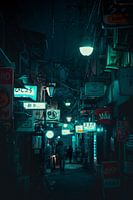 Nacht in de steegjes vanGolden Gai in Shinjuku in Tokyo, Japan. Blauw kleurenschema om de industriële look van het straatje te accentueren.