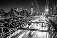Lange belichting op de Brooklyn Bridge met de skyline van Manhattan op de achtergrond.