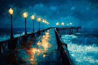 Een mysterieuze pier ontvouwt zich onder een diepblauwe hemel, bezaaid met bewolkte schaduwen. De gouden lantaarns schijnen een warm licht op de natte houten planken, terwijl de golven zachtjes tegen de steunpilaren beuken. Een vleugje melancholie en mystiek doordringt het nachtelijke landschap en nodigt je uit om te dromen en te blijven hangen.