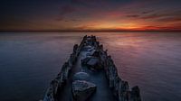 The night falls over the IJsselmeer at Hindeloopen. The last light of the day gives some color to the horizon. In the foreground an old, wooden breakwater, partly filled with large stones.