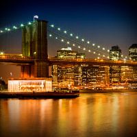 Skyline van het zuidelijke deel van New York City met de Brooklyn Bridge op de voorgrond. De lichten van de metropool worden weerspiegeld in de East River.