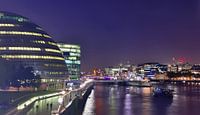 Nachtbeeld van Londense skyline met reflecties op de Theems - zakenwijk met veel kleurrijke lichten