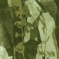 Moderne semi-abstracte botanische kunst. Bloemen en planten monotypes gecombineerd met textiel, papier en verf texturen in een mixed media collage. Neutrale, gedempte kleuren geïnspireerd door retro borduurwerk, weefkunst en de natuur. Kunstwerk voor een eclectische, retro, bohemien, new rural, Scandinavische woonstijl.