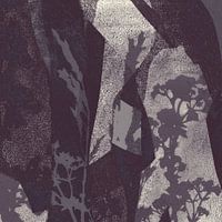 Moderne semi-abstracte botanische kunst. Bloemen en planten monotypes gecombineerd met textiel, papier en verf texturen in een mixed media collage. Neutrale, gedempte kleuren geïnspireerd door retro borduurwerk, weefkunst en de natuur. Kunstwerk voor een eclectische, retro, bohemien, new rural, Scandinavische woonstijl.