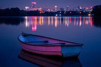 Een sfeervolle afbeelding van een oude roeiboot die zachtjes op het kalme water drijft, met de schittering van een stadsnacht op de achtergrond. De kleurrijke reflecties van stadslichten dansen op het oppervlak, wat een betoverende combinatie van natuur en stedelijke pracht creëert. De rustige omgeving en de mix van koele en warme…