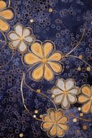 Deze betoverende compositie toont delicate bloemen die sierlijk dansen tegen een diepe, nachtblauwe achtergrond. De goud- en witgekleurde bloemblaadjes lichten op in het donker, wat een magisch en dromerig effect creëert. De kronkelende lijnen die de bloemen met elkaar verbinden, geven het gevoel van beweging en verbondenheid. Dit werk…