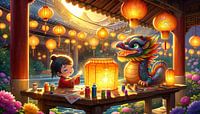 In de gloed van het avondlicht is een jong kind te zien dat zich verdiept in de kunst van het schilderen met een vriendelijk ogende draak. De tempeltuin is veranderd in een podium van licht, terwijl de kleurrijke lantaarns een warme gloed verspreiden. Deze Chinese draak lijkt het kind te helpen bij het kiezen van kleuren, een symbool…