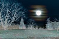 De maan staat aan de hemel achter wat sluier bewolking. Hij zet een landschap in een pastel blauw licht. Links staat een grote kale boom in een weiland.