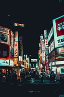 Nachtelijke verlichting en drukke borden langs de gebouwen in de wijk Shinjuku in Tokyo, Japan. Tijdens de nacht zorgen deze kleurrijke borden voor een drukke sfeer.