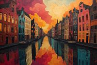 Een digitaal schilderij toont een rij kleurrijke huizen langs een kanaal bij nacht. De huizen zijn geschilderd in roze, gele, blauwe en oranje tinten, met warmgele lichten die uit de ramen schijnen. De gracht reflecteert de stadslichten, waardoor een glinsterend, spiegelend oppervlak ontstaat. De lucht erboven is diepblauw, bezaaid met…