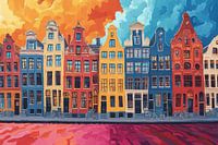 Een digitaal schilderij toont een rij kleurrijke huizen langs een kanaal bij nacht. De huizen zijn geschilderd in roze, gele, blauwe en oranje tinten, met warmgele lichten die uit de ramen schijnen. De gracht reflecteert de stadslichten, waardoor een glinsterend, spiegelend oppervlak ontstaat. De lucht erboven is diepblauw, bezaaid met…