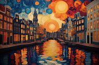 Een digitaal schilderij toont een rij kleurrijke huizen langs een kanaal bij nacht. De huizen zijn geschilderd in roze, gele, blauwe en oranje tinten, met warmgele lichten die uit de ramen schijnen. De gracht reflecteert de stadslichten, waardoor een glinsterend, spiegelend oppervlak ontstaat. De lucht erboven is diepblauw, bezaaid met…