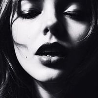 Dit artistieke zwart-wit portret legt een intense en mysterieuze uitdrukking vast, waarbij de diepte van menselijke emoties wordt benadrukt.