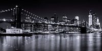Skyline van het zuidelijke deel van New York City met de Brooklyn Bridge op de voorgrond. Decoratief stadspanorama bij nacht met een reflectie van de brug en wolkenkrabbers in het water.