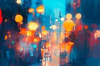 Een stralend nachtleven ontvouwt zich in een symfonische melange van heldere kleuren en zachte lichtpuntjes. Het glinsterende geel danst over de natte straten, terwijl de diepblauwe omgeving een mysterieuze stemming creëert. Dit meesterwerk zou perfect staan in een woonkamer of hal en bezoekers verwelkomen met een vleugje stedelijke magie.