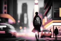 In dit verbluffende beeld zien we de rug van een enkele volwassene die 's nachts midden in een drukke stad loopt. De levendige straat wordt verlicht door moderne architectuur en voorbijrazende auto's, waardoor deze in een fascinerend licht komt te staan. Het contrast tussen de anonimiteit van het individu en het pulserende leven van de…