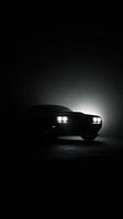 Het silhouet van een klassieke Dodge Challenger wordt op dramatische wijze onthuld door de helderwitte koplampen die door de dichte mist snijden. De scène is minimaal en concentreert zich op de donkere vorm en de intensiteit van de verlichting.