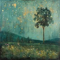 Nachthemel | Starlight Whispers in Nature - Dit landschapsschilderij toont een sereen nachttafereel met een prominente eenzame boom op een veld vol bloemen, bezaaid met gloeiende stippen die doen denken aan vuurvliegjes of sterren tegen een diepblauwe lucht.